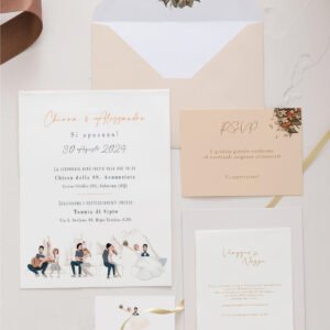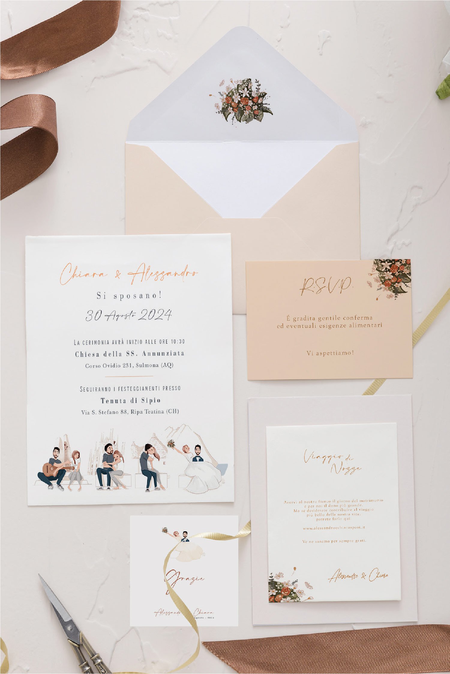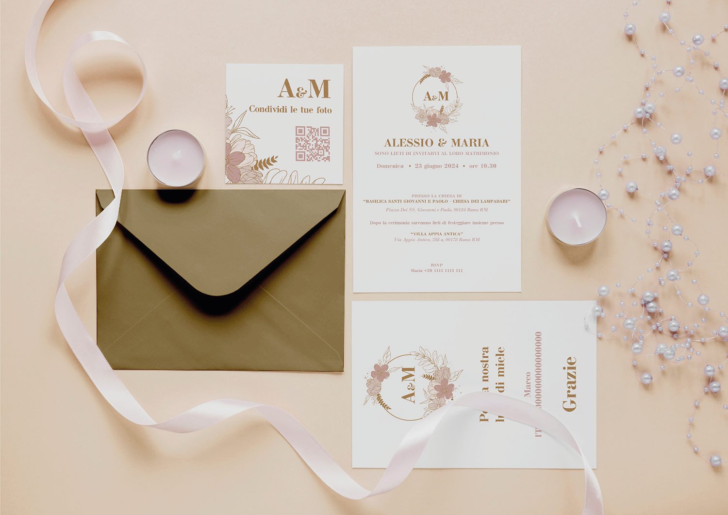 Biancopuro creates wedding invitations, stationery, and coordinated sets with a modern, refined design. We also offer a Live Sketch service with on-the-spot illustrations for your special day, along with wedding websites and digital invitations.